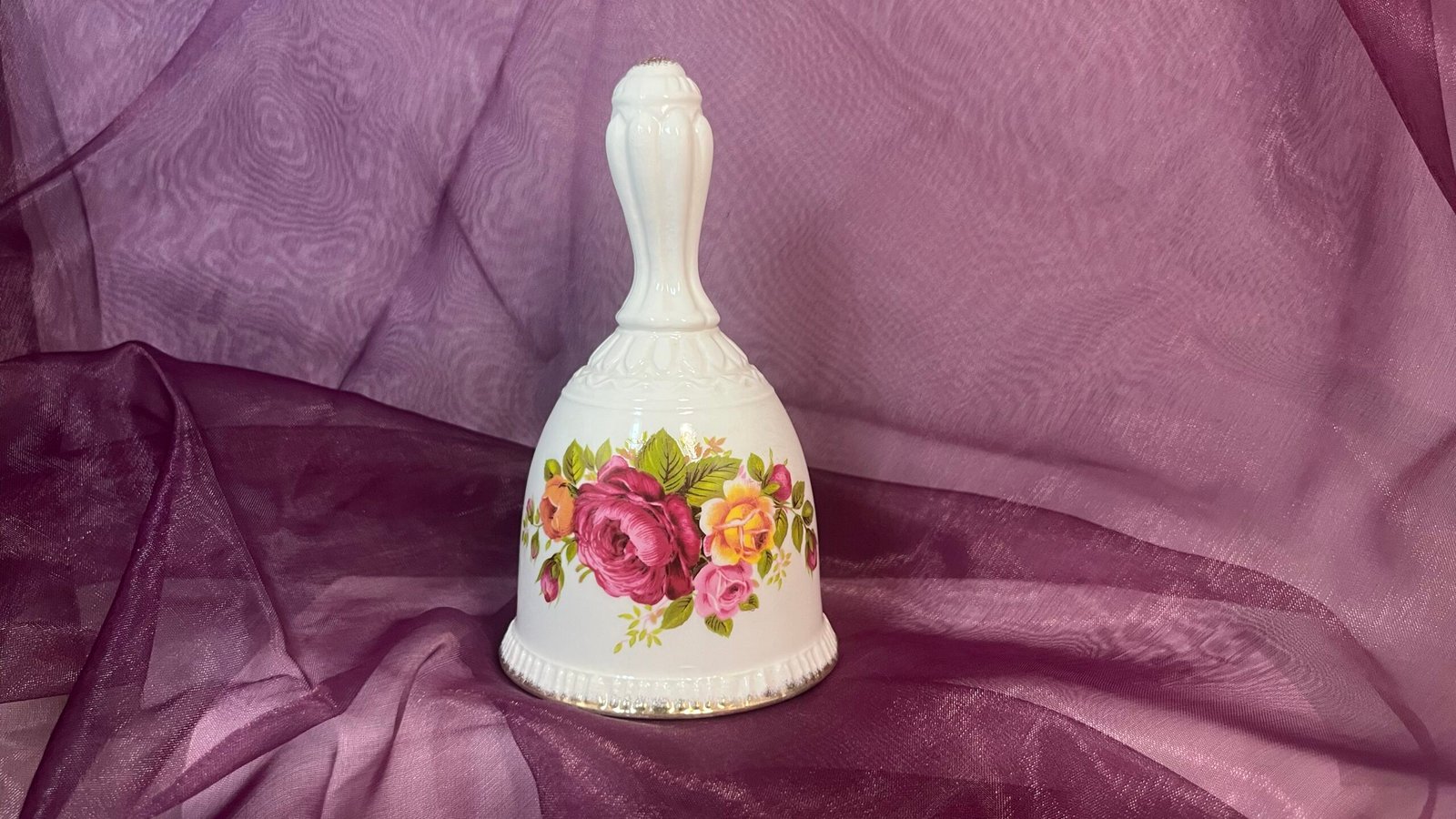Introducing the Fine Bone China “Cottage Rose” dinner bell – a stunning combination of artistry and function. Adorned with a graceful pink floral motif on a pristine white finish, this dinner bell radiates classic elegance. The subtle gold trim adds a sophisticated touch, enhancing its vintage appeal. Standing 12.5 cm in height, this dinner bell is made in Taiwan, showcasing the quality of fine bone china.