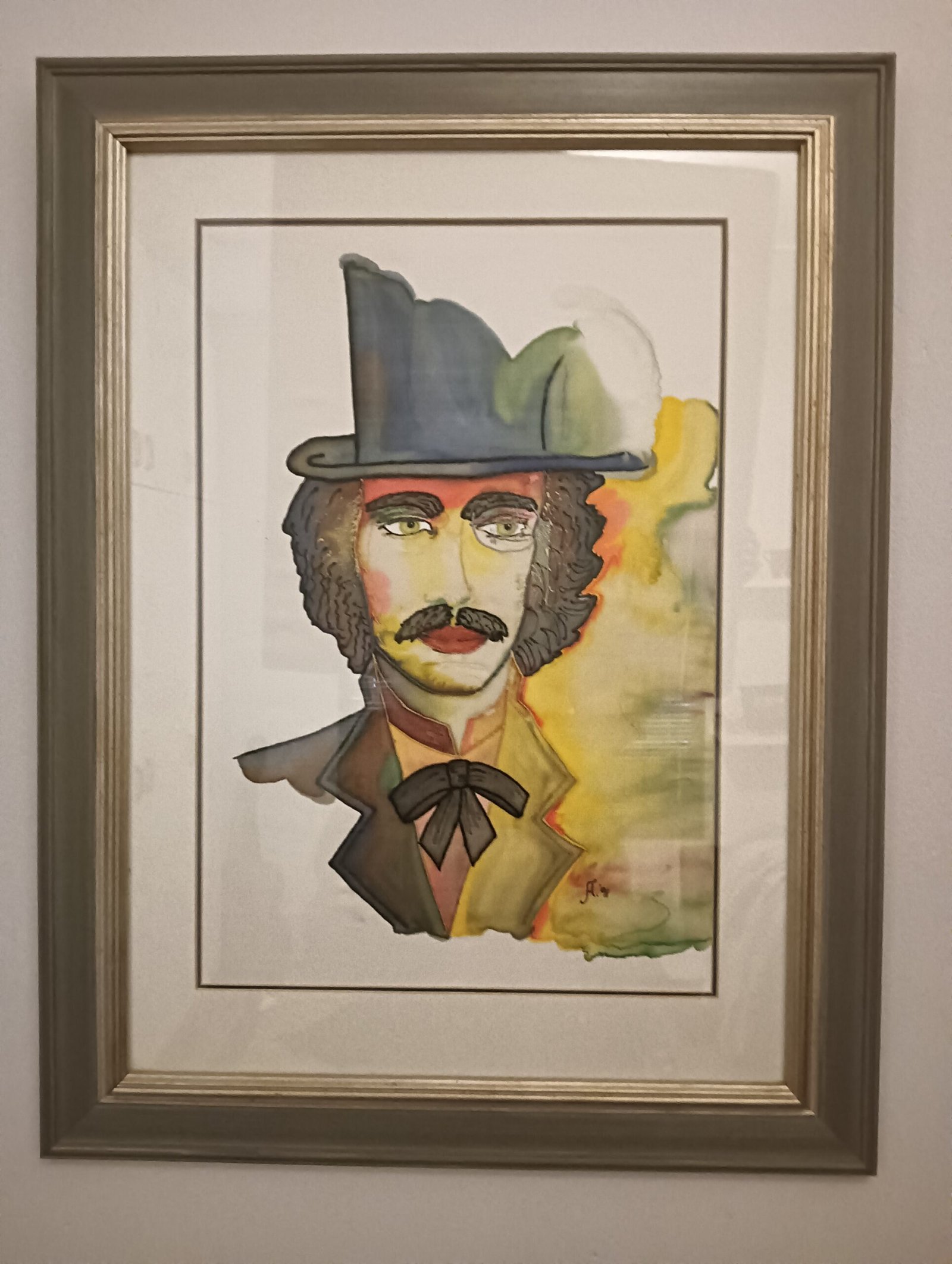 Timeless Elegance with Silk Art Bring sophistication to your space with this stunning framed silk painting. Featuring a striking portrait of a man in a top hat, this artwork captures an air of timeless charm and refinement.