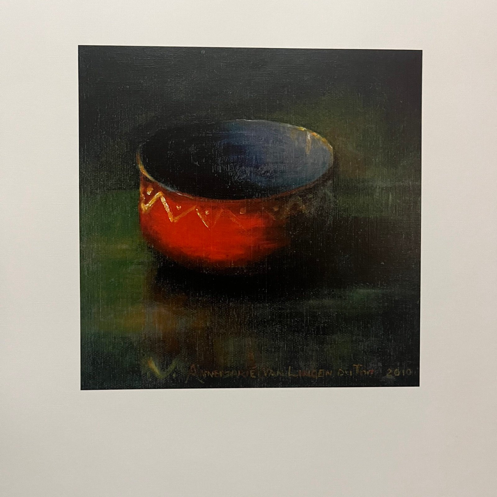 This print features the artistry of Annemarie van Lingen du Toit. It showcases a vibrant red bowl with gold patterns set against a deep green-black background. The artwork itself measures 20×20 cm, beautifully contrasted on a high-quality white paper sized 42×29.5 cm.