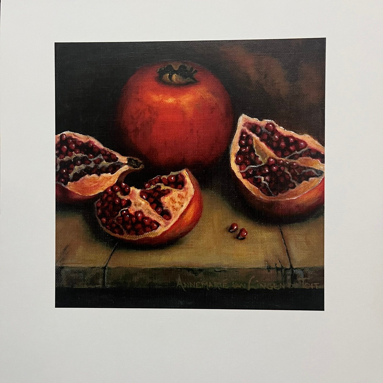 Experience the beauty of Annemarie du Toit’s print of a Pomegranate painting. This painting captures the exquisite details of pomegranates displayed on a table. The picture itself measures 20.5 x 20.5 cm, printed on a sturdy white background sized at 40.5 x 29.5 cm.