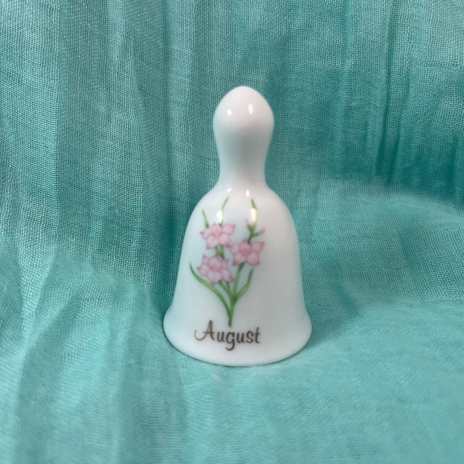Celebrate the month of August with the Russ Berrie mini porcelain bell, a charming collectible designed to bring a touch of elegance to your space. Adorned with beautiful light pink flowers, the porcelain bell radiates sophistication and grace. Its white finish complements the delicate floral accents. Standing at just 4 cm tall, this mini bell is designed to be a versatile decorative piece.