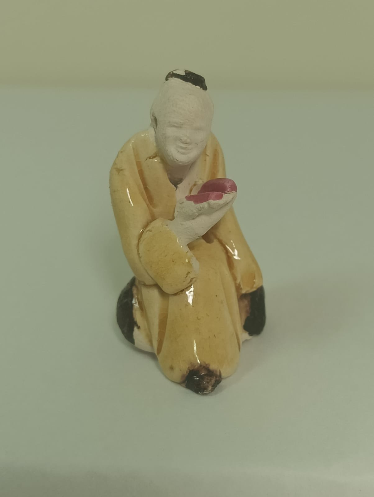 Discover the elegance of a very small hand-painted ceramic figurine. Beautifully sculpted, this piece features a kneeling figure offering a delicate bowl. The figurine is finished in soft earthy tones with a subtle glazed surface. Its design is further enriched by gentle signs of wear, adding a sense of age and character. The height is 2,5cm.